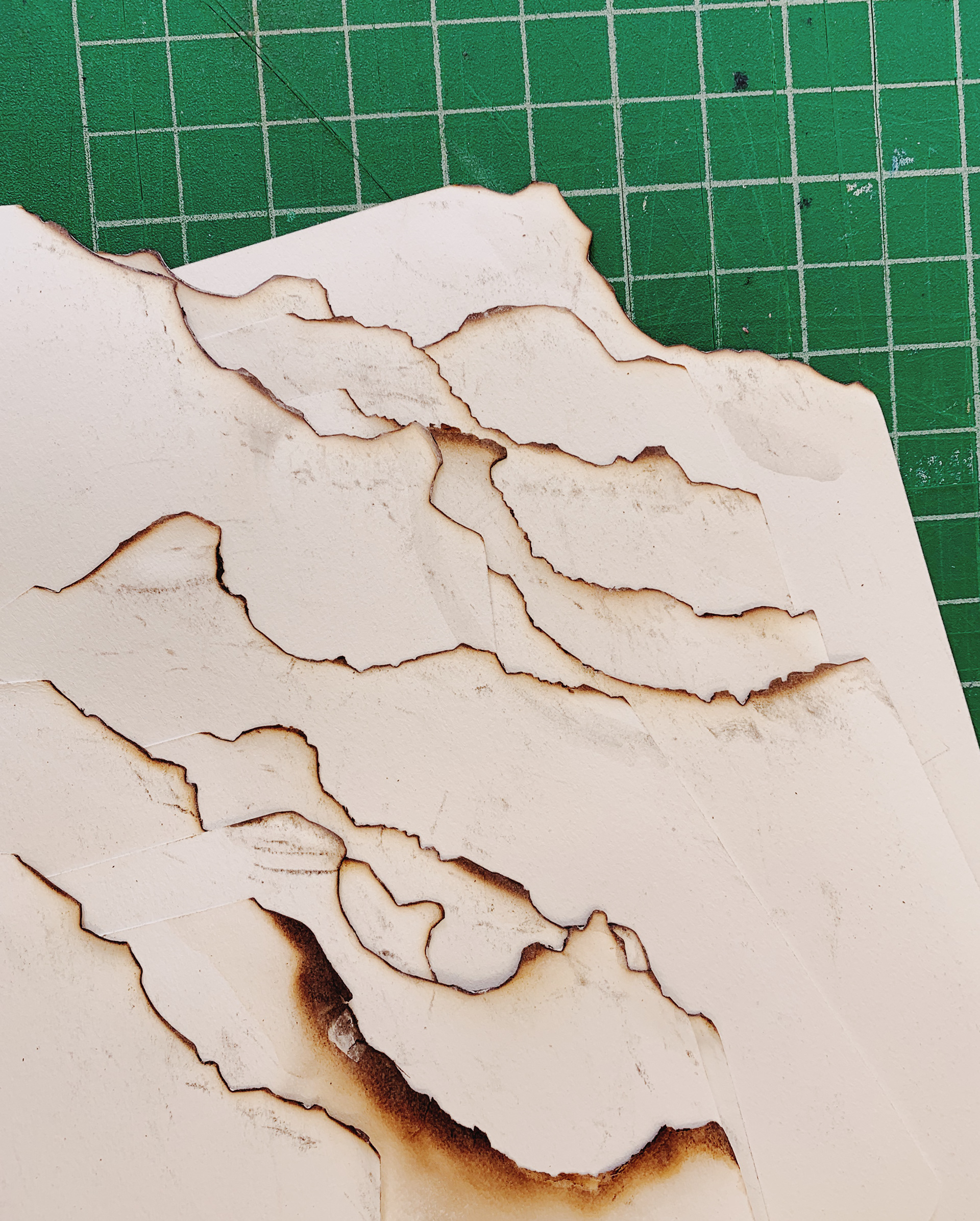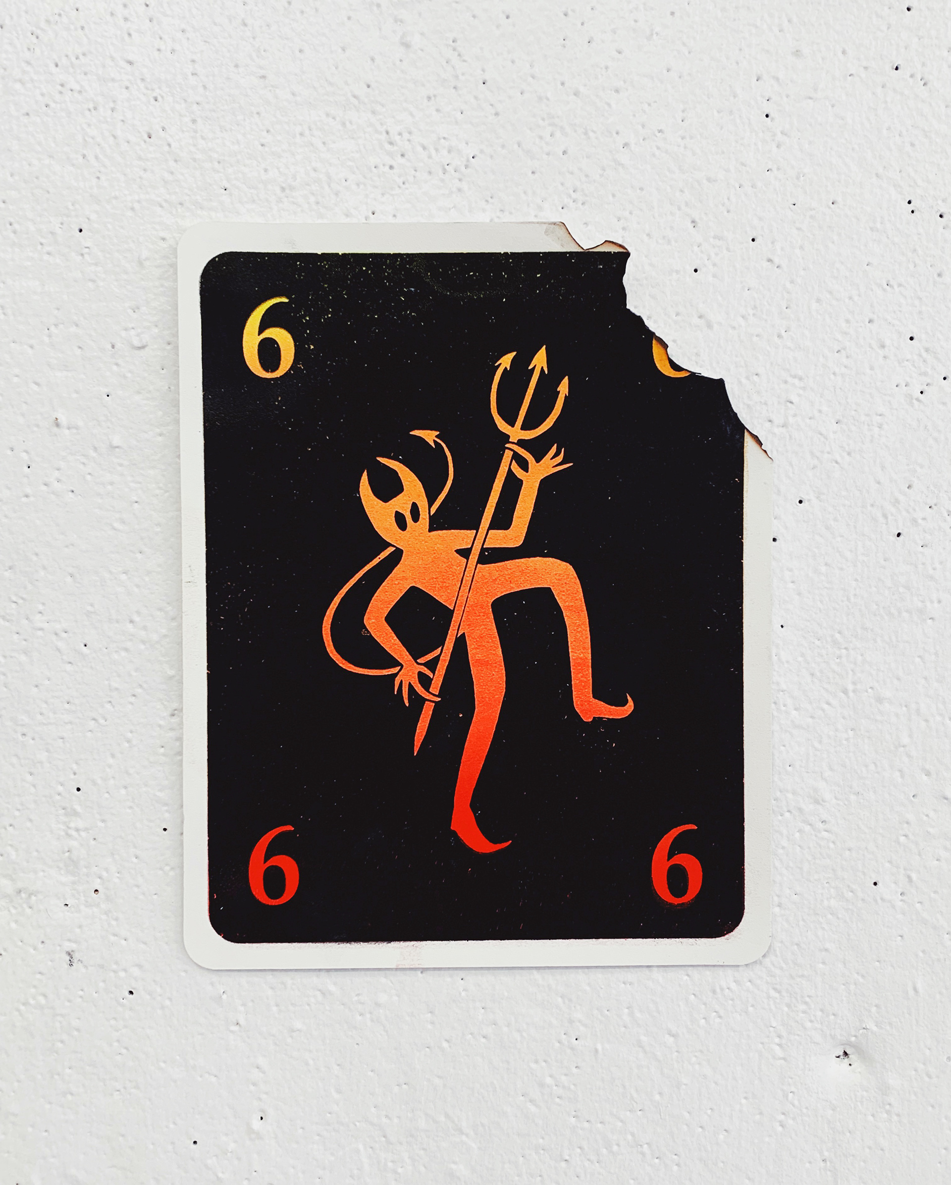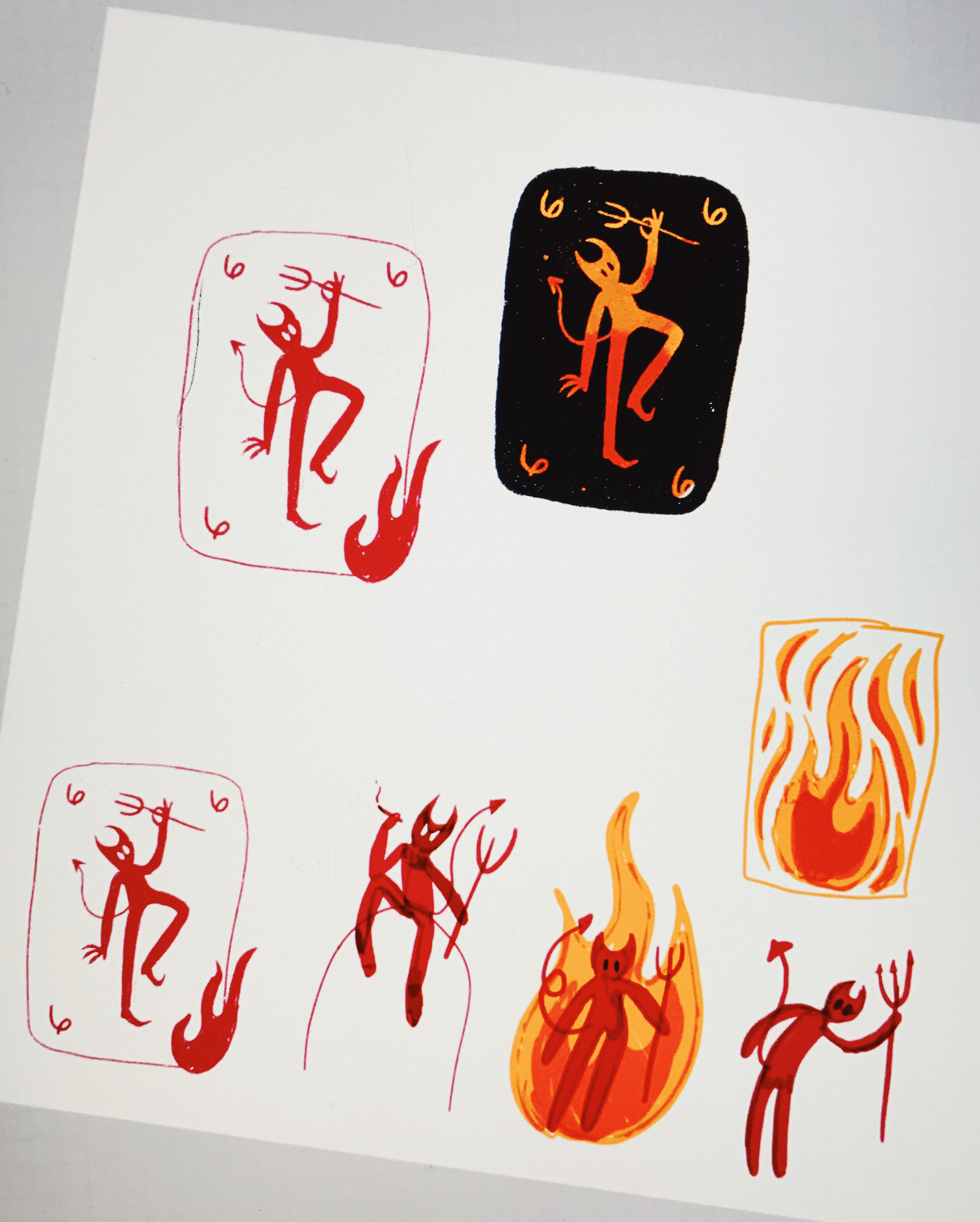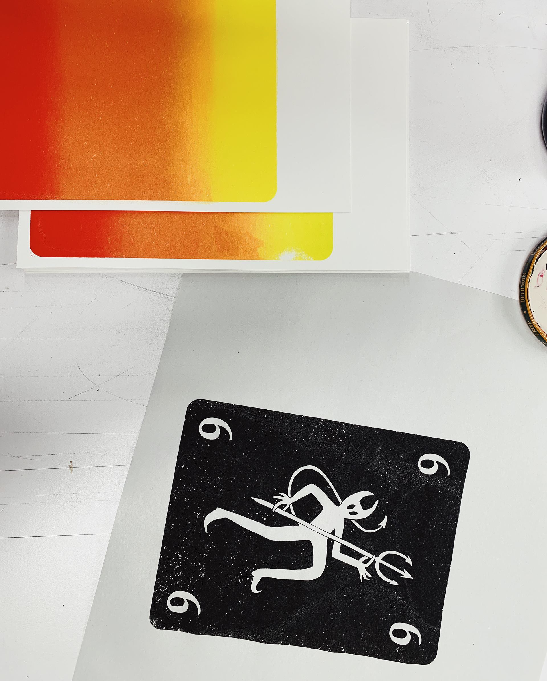 Two-layered screenprints featuring a playful devil illustration and individually burned corners.